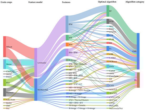 This section returns to the proposed research question through the detailed information we extracted. We have visualized and analyzed the data for the detailed information of the systematic review, as shown in Figure 5. Most research questions can be answered based on this figure. In the figure, IFM represents information from multispectral images, IFR represents information from RGB images, IFH represents information from hyperspectral images, and IFT represents information from thermal images (the information mentioned here includes vegetation indices extracted from images, reflectance bands, calculated plant height, and texture features). Unimodal refers to data sourced from a single channel, such as using IFM in research, while multimodal refers to data sourced from multiple channels, such as using IFM and IFR in research. R-image represents RGB image, M-image represents multispectral image, and T-image represents thermal image. RF stands for random forest, SVM stands for support vector machine, KNN stands for k-nearest neighbor, MLP stands for multilayer perceptron, GPR stands for Gaussian process regression, PLSR stands for partial least squares regression, RR stands for ridge regression, EL stands for ensemble learning, GBR stands for gradient boosting regression, DNN stands for deep neural network, ANN stands for artificial neural network, CRT stands for classification and regression tree, LR stands for linear regression, CNN stands for convolutional neural network, and LSTM stands for long short-term memory. GML stands for generalized machine learning, and DL stands for deep learning.
