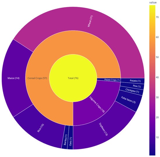 By extracting and summarizing the data, we found that UAVs and ML have been used in yield estimation studies for a variety of grain crops, as shown in Figure 6. Since the crops studied in reference [42] include wheat, barley, and oats, there were 76 crop counts, even though we retrieved 74 articles. From the chart, we can clearly see that the studies were mainly focused on cereal crops, with 75%, followed by legume crops with 23%, while very few studies were performed on potato crops. Among the cereal crops, the major studies were on the three major cereal crops of wheat, corn, and rice, accounting for 96%. Soybean is the main legume crop with 72%. The potato crop was the subject of only one study. The emergence of this phenomenon is in fact closely related to the importance of grain crops. The more important the crop is, and the larger the area planted, the more attention researchers pay to it. There will also be more planning and agricultural management methods in experimental design. This is also related to drones. Especially for potato crops, since their fruits grow underground, UAV carrying sensors can only obtain canopy characteristics to indirectly estimate their yield, but cannot directly obtain information about the fruits (e.g., number, color, etc.), which limits the ability to estimate potato yield through DL. This is because it is not possible to obtain information about fruits such as wheat ears through image data, as in the case of wheat. For example, Peng et al. [43] use a DL algorithm (Mask R-NN) to extract three ear phenotypic features of wheat at the ripening stage, including ear count, ear size, and ear anomaly index. Based on these features, RF is used for yield estimation modeling.