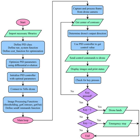 - Initialize the drone and set up communication using ‘djitellopy’ [41,42].
