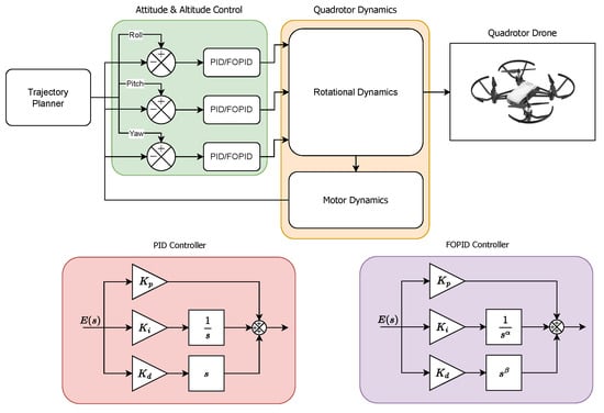 Block diagram of the PID and FOPID control implementation on the quadrotor.