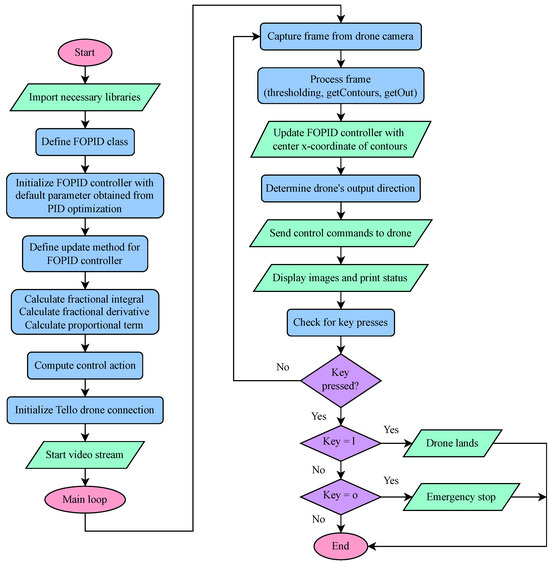 Implementing control algorithms on the quadrotor requires integrating both hardware and software systems, followed by extensive testing and validation to ensure the effectiveness of the control strategies. The control algorithms were initially embedded into the drone’s onboard microcontroller, programmed to execute these algorithms and interface with the drone’s motors. The sensors provide real-time data on the drone’s orientation, acceleration, and other crucial flight parameters. Communication modules facilitated data transmission between the drone and the ground control station, allowing for remote monitoring and control. The software is developed using Python, libraries such as ’djitellopy’ for drone communication and control, and ’scipy’ for implementing fractional calculus in the FOPID controller. All of the Python codes developed for this research are available at https://github.com/KishoreBingi/Fractional-Order-Control-Algorithm-for-Tello-EDU-Quadrotor-Drone (accessed on 24 September 2024). The implementation structure of the PID and FOPID controllers on the drone is given as a block diagram in Figure 4. The series of test performances for the control algorithms is as follows: