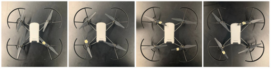 The primary objective of the experimental design is to assess the effectiveness of the PID and FOPID controllers in maintaining drone stability and achieving safe landings during propeller disturbances. Four distinct experimental cases, each representing a different disturbance scenario, were created and maintained until the test completion to comprehensively evaluate the controllers’ performance. For effective comparison, the same lightweight masking tape material (see Figure 2a) has been used in all four experiments, as shown in Figure 6. Lastly, all the case performance is comparatively analysed to validate the proposed FOPID’s effectiveness in handling the external disturbance with smoother and more robust control actions.