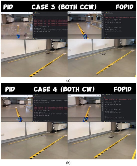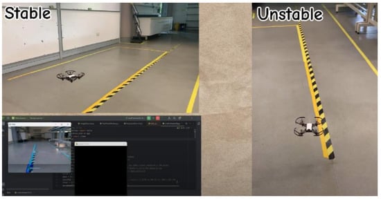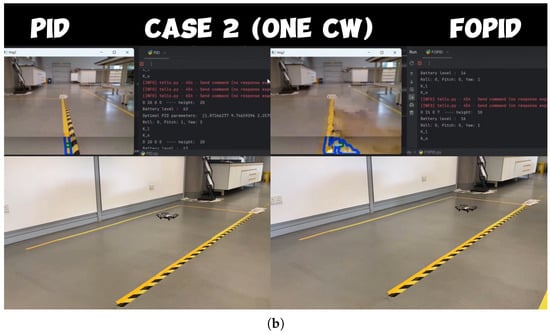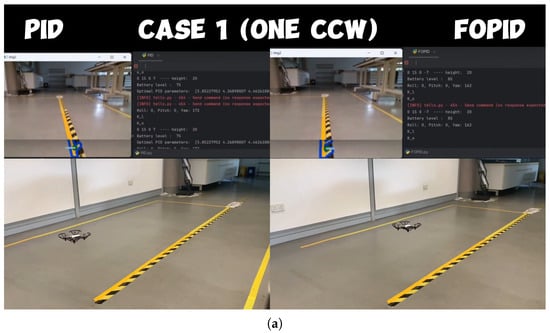 Comparing the drone’s ability to maintain line tracking accuracy amidst varying levels of disruption, we can comprehensively understand the algorithm’s robustness and adaptability to implement the PID and FOPID controllers on the drone. During indoor testing, case 2 compares its performance with a standard drone in a line-following test. As depicted in Figure 7, the drone maintains a consistent hover at the same altitude for stable and unstable testing once airborne. The assessment of drone stability is carried out during the line-following task. Subsequently, the stable drone successfully follows the line to its end without encountering any issues. In contrast, the unstable drone continues to hover erratically and rotates in an attempt to locate the line due to its instability. For additional details on the testing process, please refer to the video: https://youtu.be/M3OsUNe15DY (accessed on 15 August 2024).