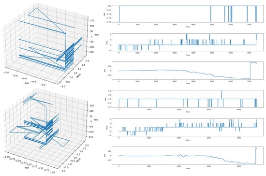 In case 4, when disturbances affected both clockwise propellers, the PID controller showed noticeable roll, pitch, and yaw fluctuations, resulting in decreased stability, as shown in Figure 13. The higher proportional gain emphasized the controller’s aggressive response to counteract unstable trajectory movements caused by dual disturbances. However, the observed instability indicated limitations in effectively stabilizing the drone under these conditions, suggesting that the PID controller was not well-suited for managing scenarios involving multiple propeller disturbances. On the other hand, the FOPID controller demonstrated resilience and stability by effectively mitigating the disturbances, leading to controlled trajectories and reduced unstable behaviour compared to conventional PID controllers.