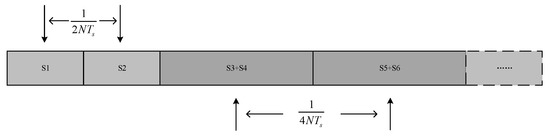 and where angle(·) is used for angle calculation, which can maximize the range of fractional frequency offset estimation when the time interval distance between repeated sampling blocks is minimized. Figure 4 shows the range of fractional frequency offset estimation at different time intervals, where S1, S2, ..., SN are the leading repeated symbols. When using S1 and S2 for fractional multiplication bias estimation, due to the shortest interval between them, it is obvious that they have the largest estimation range. When estimating the sampling blocks composed of S3 and S4, as well as the sampling blocks composed of S5 and S6, the distance between them becomes twice that of the adjacent symbol sampling blocks, resulting in a reduction of the final estimation range to half of the original range. Due to the range of the phase symbol angle(·) of [−π,π), if adjacent symbol sampling blocks are used for estimation, the maximum range of fractional frequency offset estimation is |Δf1| ≤ 1/2NTs.