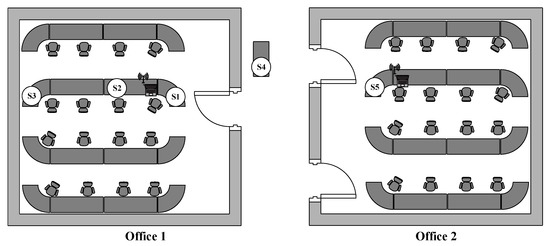 The specific collection locations of each dataset are shown in Figure 6. There are five sets of signal frames in a stationary state. Among them, the indoor stationary datasets S1, S2, and S3 were collected in Office 1, and S4 is located in the hallway at the entrance of Office 1, S5 is collected in Office 2. The number of data frames for each device in S1, S2, S3, and S4 datasets is equal, while the number of data frames for each device in S5 is approximately equal. Generally, the sending rate of PX4 drones to ground stations is about 700 per minute, the longest collection process for these stationary datasets is about 7–8 min. Then, the collection dates of these five datasets span over several months, which can effectively examine the stability and reliability of the extracted RFF. The specific information regarding the number of data frames, collection date, and transceiver distance is shown in Table 1.