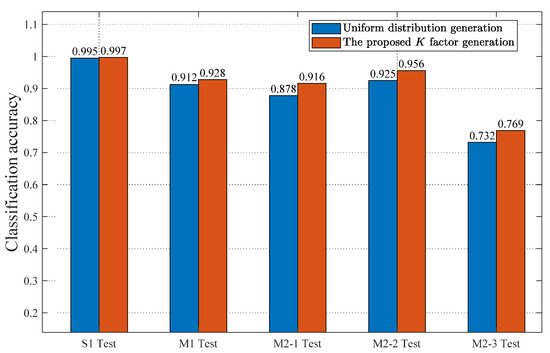 Figure 9 compares two sets of random parameter generation methods, including the uniform distribution method and the environmental measurement method. The figure shows that the generative channel enhancement using uniformly distributed K values results in slightly weaker average classification performance of the model. In deep learning, it is required that the distribution pattern of the training set samples be consistent with that of the test set [10]. This principle ensures that the data samples encountered by the model during training and testing have the same statistical characteristics, allowing the model to leverage the experience learned during the training phase. First, using uniformly distributed K values in the generative channel enhancement method will ultimately result in the dataset containing a large number of rare samples from real-world environments. At the same time, there are many severe fading signal samples in the dataset, which increases the complexity of the dataset and makes it difficult for the model to converge [11]. On the contrary, in data augmentation, K values generated based on environmental measurement methods are used to make the channel distribution of the training set more in line with the actual distribution in the environment, i.e., the training set and the test set have better consistency in distribution, further enabling the model to demonstrate better classification performance. Therefore, in this experiment, a K value generation strategy based on environmental measurement methods was adopted.