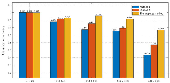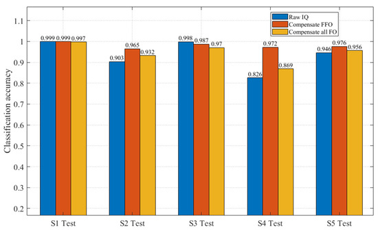 In order to test the effectiveness of the proposed fractional frequency offset compensation method, separate tests were conducted on datasets in various static indoor environments. The static indoor scenario is considered due to evaluating purpose. Due to the absence of fast fading effects caused by drone mobility in indoor stationary environments, it can be considered that the environmental channel has a weak impact, and there are no frequency fluctuations caused by Doppler frequency shift, drone body vibration, motor rotation, and other factors. The typical relative frequency offset numerical values for Doppler shift, motor rotation, structural vibrations, temperature are roughly several hundred Hz to several thousand Hz. Therefore, there is no need to perform data augmentation on the training set S1. In a stationary state, the main influencing factors of RFF recognition are the frequency deviation changes of the crystal oscillator caused by environmental temperature or device startup time. To this end, we compare two common traditional approaches: the traditional method of preserving the complete frequency offset without processing and the traditional method of removing the complete frequency offset features. Note that the frequency offset can be estimated including the integer part and the fractional part. Without any frequency compensation, the signals are referred to as preserving the complete frequency offset, while the case that removing the complete frequency offset features refers to removing both the integer part and the fractional part. The experimental results are shown in Figure 13.