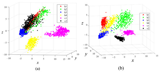 To demonstrate the improvements of the model’s generalization ability by the data augmentation module, Figure 11 compares the RFF extraction capabilities of the feature extraction layers of model Mod1 based on Method 1 and model Mod2 based on the RFF method for drone, and visualize their ability to extract RFF in dataset M2-1. The sample length of the drone preamble sequence is 800 sampling points. The feature extraction layer of this model takes a 3 × 800 matrix composed of I-branch, Q-branch, and phase information as inputs, and finally outputs a 192 dimensional feature vector. Due to the high dimensionality of the feature vectors, which is not conducive to visualization operations, principal component analysis (PCA) is used to reduce the dimensionality of the feature vectors to three dimensions. Obviously, model Mod1 based on method 1 in Figure 11a is no longer able to distinguish between drone data transmissions h1, h2, h3, and v2 in the scenario of drone air ground channels. The RFF of these four devices are highly confused in the feature space. However, Mod2 based on the RFF method for drone, as shown in Figure 11b, is still able to perform well in this case and can distinguish RFF of all devices, achieving a classification accuracy of 95.6%.