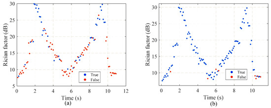 For test set M2-3, due to the fast drone movement speed (8–2 m/s) in the horizontal flight scenario, the air ground channel effect is the most severe among all test scenarios. Visualize the relationship between the recognition accuracy of device h2 in the test set and the K factor. Figure 12 shows the test results of Method 2 and the proposed RFF method, respectively. “True” is the correct classification, and “False” is the incorrect classification. Figure 12a shows that when K < 20 dB, Method 2 has a high model misjudgment rate and cannot reliably extract RFF. On the other hand in Figure 12b, the generative channel enhancement in the RFF method enables the model to have reliable RFF extraction capability in low K value scenarios. This is mainly because the generative channel enhancement step effectively improves the relatively single channel environment in the original training set. By introducing low K value Rician channels and a small portion of Rayleigh channels, the model exhibits high generalization ability in the actual drone low K value air ground channel scenarios.