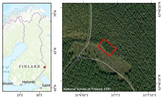 Test area (red rectangle) in Ilomantsi, Finland (red circle).