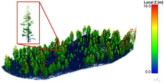 The other under-canopy drone system, provided by Deep Forestry, was used in the autonomous mode to perform a simple 3D forest mapping task. The UAV flight covered an area of approximately 40 × 100 m. The processing of the LiDAR data using the Deep Forestry SLAM method resulted in a final 3D point cloud containing ca 11 milion points, corresponding to a scanning density of 2860 points/m2. The visualization of this raw input 3D data for further processing is presented in Figure 6. A summary of the collected data is presented in Table 1, detailing the type, size, and purpose of each dataset.