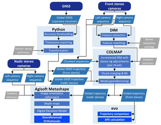 Proposed workflow for processing data from a dual (front and nadir) stereo vision system.