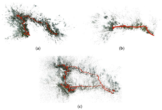The results of all three approaches are shown in Figure 8. In particular, the workflow based on SIFT was unable to maintain tracking throughout the sequence (Figure 8a). However, after passing a difficult part of the dataset (at approximately 25% of the flight time, where the drone rapidly changes orientation inside the forest), it was able to orient the remaining 4162 frames, which comprise almost 74% of the input images. The DISK-based trajectory was reported by COLMAP as fully correctly oriented; however, even the qualitative examination of its shape and the sparse point cloud shows issues in the results (Figure 8b). Although the initial part of the sparse reconstruction, at the forest edge, seems of high quality, inside the forest, the 3D reconstruction became corrupted and produced an unreliable pose estimates. Finally, the photogrammetric process based on SuperPoint (Figure 8c) produced qualitatively good results and oriented all frames, resembling the SIFT-based trajectory where the latter was successfully computed. A more in-depth analysis of the pose estimation results is presented in Section 6.