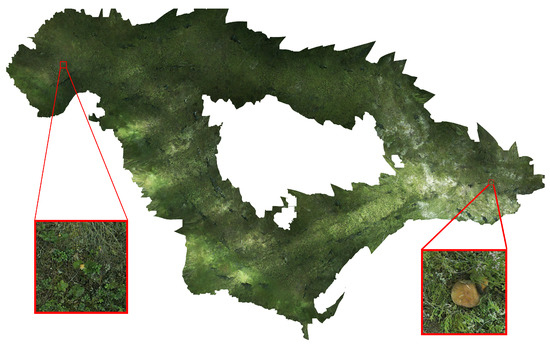 Orthomosaic created using SuperPoint-based photogrammetric processing. The two close views show cropped full resolution details with a cloudberry (left) and a mushroom (right).