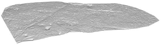 The first step of processing the LiDAR data involves point cloud cleaning. After removing the noise with a SOR filter, outliers clearly falling outside of the area of interest and dynamic obstacles were removed (i.e., by a human supervisor following the UAV). The filtered point cloud contained ca 9 million points (~80% of the initial size). After the initial CSF filtration, the pre-segmented ground points were used as input for the meshing procedure. The mean average error (MAE) and the root mean square error (RMSE), calculated based on distances between the initial ground points and the generated mesh, were equal to 10 cm and 13 cm, respectively. These relatively high residuals were caused by elements of the natural forest floor, such as grass and low shrubs. The output ground surface model is visualized in Figure 10.