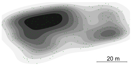 To obtain the high vegetation point cloud, signed distances from the ground surface were calculated. Points located at least three times further from the ground than the fitting RMSE (i.e., 40 cm) were assigned to the tree class and further analyzed with the Treeiso method. The algorithm detected 258 tree instances, shown in Figure 11. Their planar centroids were used to calculate the 2D KDE of the tree density distribution for the later visualization in the mobile app (Figure 12).