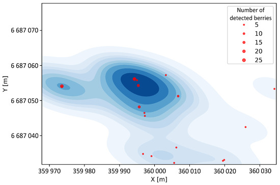 Example of a bilberry distribution heatmap generated from the detections in the georeferenced images. Dots represent image positions (scaled by the number of detections); darker regions depict higher spatial concentrations of fruits.
