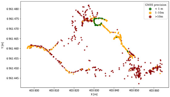 The next step involved georeferencing the previously computer UAV trajectory. To do this, only the highest quality GNSS positions (i.e., with planar positioning accuracy below 1 m) are selected as a global reference. The GNSS timestamps are matched with the front-facing stereo images, obtaining the average discrepancy of 0.09 s. Given the limited quality of global positions and low flight speed, such a low discrepancy value is insignificant for transformation calculations.
