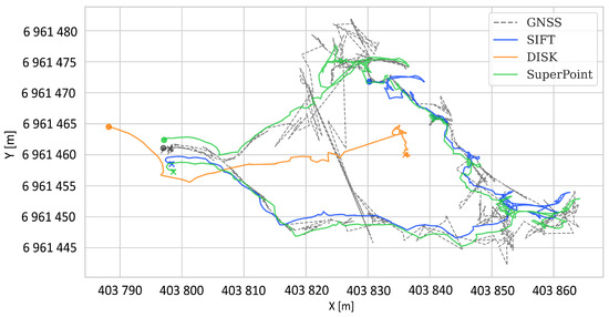 The comparison between GNSS-derived trajectories and those estimated using V-SLAM techniques highlights the clear advantages of image-based trajectory estimation in forested environments. Both SIFT and SuperPoint demonstrate more consistent and stable trajectories, whereas the GNSS positioning suffers from frequent and significant pose jumps (Figure 16). This stability is critical for ensuring the UAV system’s navigational accuracy and reliability in challenging conditions.