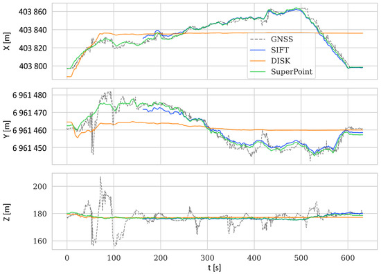 Despite the challenges, both SfM solutions using SIFT and SuperPoint maintained good overall alignment with the global positioning trends indicated by the GNSS data. This is evident when examining the X and Y components of the trajectories (Figure 17), where both of them (in the portion of the dataset where orientation was successful for the latter) closely follow the GNSS-derived path. The alignment is particularly pronounced in the Z component, where the GNSS data exhibit large, abrupt jumps of up to 20 m.