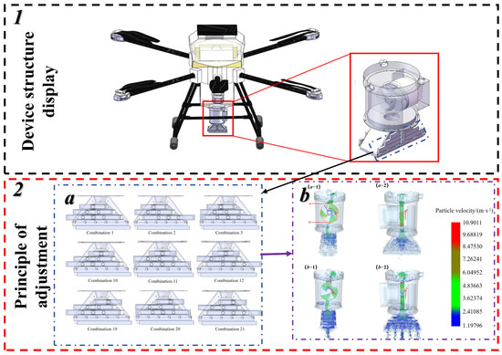 Figure 1 illustrates the overall structure of the spreading drone and the particle motion principle of the spreading device. As shown in Figure 1.1, the variable spreading device is installed below the drone. The device controls the descent of particulate flow through a flow regulation fan. The device is equipped with three sets of adjustment units to alter the descent distribution of the flow, thereby achieving the same flow state under different distribution conditions. Some of the structural changes in the device and a schematic representation of the particle flow are shown in Figure 1.2.