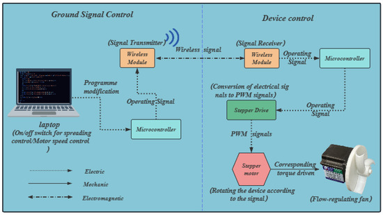 Figure 3 is the variable adjustment control process of the normal spreading device. In this study, the control module is divided into a ground signal control module and a device control module, aiming to achieve precise control of the descent speed and amount of fertilizer by regulating the speed of the stepper motor. The ground signal control module is configured with a laptop, microcontroller, and wireless module. The laptop is responsible for program modifications and command execution settings for the microcontroller. The microcontroller, in turn, sends signals to open the device and adjust the speed through the wireless module. The device control module consists of a wireless module, microcontroller, stepper drive module, stepper motor, and execution device. The wireless module receives instructions from the ground signal control module. The microcontroller processes the received instructions and transmits the processed control signals to the stepper drive module. The stepper drive module converts electrical signals into pulse signals, thereby controlling the rotation and speed adjustment of the stepper motor. This, in turn, drives the flow-regulating fan to achieve the desired speed for specific requirements. Through this precise control process, it is possible to effectively adjust the speed of the stepper motor, thus accurately controlling the rotation speed of the flow-regulating fan and achieving fine adjustment of fertilizer discharge.