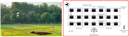 A schematic of the test site is shown in Figure 4. On the test site, 3 rows of fertilizer collection boxes (500 × 500 × 200 mm) were arranged parallel to the drone’s flight direction, with a row spacing of 0.5 m, a total length of 6.5 m, and 7 collection boxes per row. The spacing between the collection boxes extended from the center of the flight path (0 m) to both sides, with a spacing of 0.5 m.