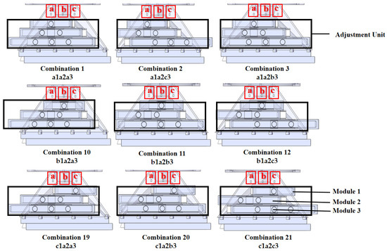 Figure 5 illustrates the structure of some of the device test groups. According to the position corresponding to the center line of the regulating modules (modules 1, 2 and 3), they are divided into three main categories, a, b, and c. The modules of group 1 are all at a, so they are named a1a2a3. Module 1 of group 21 is at c, module 2 is at a, and module 3 is at c, so the group is named c1a2c3. At the same time, the test was carried out to test the effect of the change in the structure of the regulating unit on the distribution of the fertilizer deposition for the changes in the regulating unit as the main factor. A total of 27 experimental groups were set up, with specific names listed in Table 1.