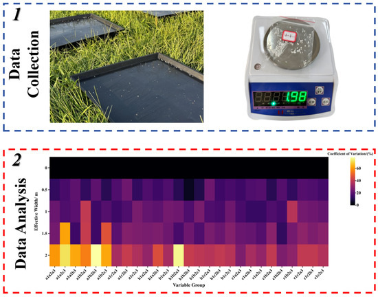 Figure 6.2 shows the directions for analyzing particulate data, including particle deposition analysis and effective spreading width analysis of the drone. For a single route there is the option of adjusting the device for different fertilizer deposition states. The data from the three collection strips were also calculated, and when the variability in the three data points was small, the mean of the three data points was taken for data analysis. When the variability was large, the data set was rounded off and a re-test was performed. Calculations of fertilizer particle deposition mass and coefficient of variation were carried out for the collected experimental data according to Equations (1) and (2).