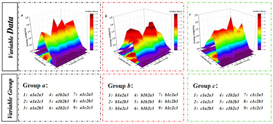 Table 4 presents the data on the particle variability range for group c. In group c1b2b3, the particles have the highest variance of 0.8, with a variability range of 0.25–37.59%. In group c1a2a3, the particle fertilizer has the smallest variance of 0.41, with a variability range of 1.86–39.36%. In group c1b2c3, the particles have the largest variability range, from 0.24% to 58.68%, with a variability difference of 58.43%. In group c1c2b3, the particles have the smallest variability range, from 0.5% to 36.07%, with a variability difference of 35.57%.