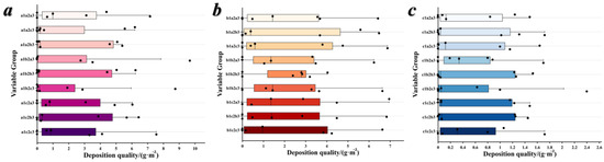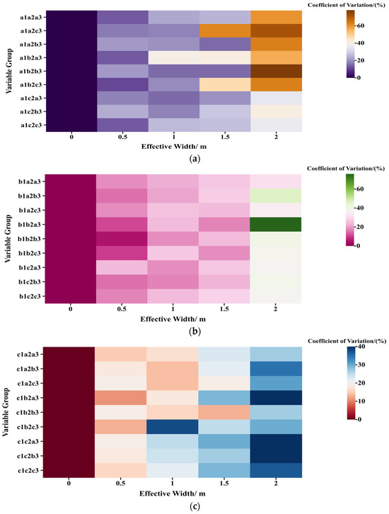 Figure 9c shows the effective width of particulate deposition for group c. Overall, the coefficient of variation (CV) for group c1c2a3 can reach up to 40%, while the lowest CV for particulates is 0, corresponding to the state where the original route remains unshifted. For group c1b2b3, when the effective width reaches 2 m, the coefficient of variation (CV) is 27%, with an initial minimum CV of 19% and a range from 19% to 27%. In group c1b2a3, when the effective width reaches 2 m, the coefficient of variation (CV) is 40%, with an initial minimum CV of 11% and a range from 11% to 40%.