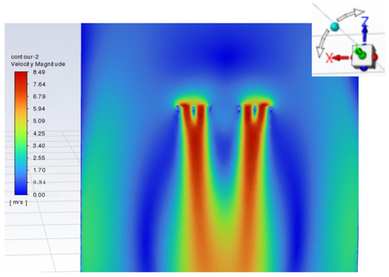 The aim of this study was to investigate the effect of structural changes in the conditioning unit on fertilizer deposition and to understand the more refined distribution of fertilizer deposition in this state. Therefore, the experiments were designed with the conditioning unit as the main factor, while keeping the flight speed of 2.5 m/s, flight altitude of 3 m, and external wind field of <3 m/s as invariant factors so as to maintain the consistency of the rotor wind field during the operation, reducing the impact from the rotor wind field on the evaluation. The Flunt rotor wind field simulation is performed on this UAV, and the wind field velocity cloud map changes in the integrated direction, as shown in Figure 10. The rotor wind field has an overall change in wind field velocity in the XZ plane, converging from the outside towards the middle of the UAV. The spreading device is installed at the position of the UAV’s proper center, which can effectively reduce the influence brought by the rotor wind field of the UAV.