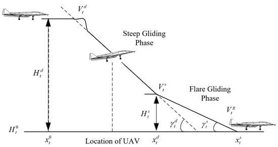 The autonomous landing process in this paper includes a steep gliding phase and a flare gliding phase, as illustrated in Figure 1. The formulation of the landing trajectory starts from the flare gliding, which is determined based on specified criteria at the landing point. Subsequently, steep gliding involves the consideration of parameters such as the lift-to-drag ratio, landing constraints, and thrust characteristics.