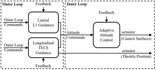 The control system structure, as shown in Figure 2, follows an inner–outer loop control structure. The outer loop is responsible for trajectory tracking control, converting the flight mission into attitude commands, and the inner loop, designated as attitude control, determines the deflection of each control surface, thereby enabling the UAV to follow the preset route.