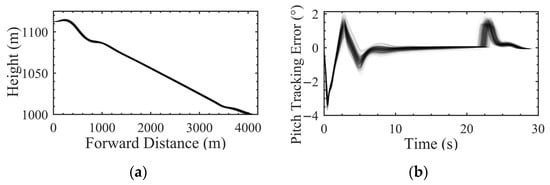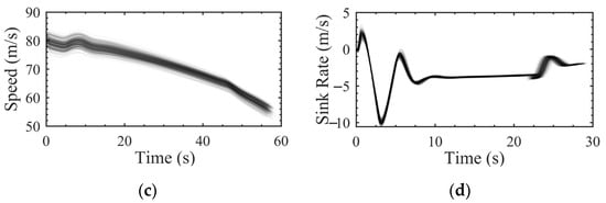 Time-domain curves for Monte–Carlo simulation. (a) Height-Forward Distance, (b) Pitch Tracking Error, (c) Speed, (d) Sink Rate.
