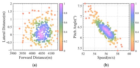 Density map of landing index for Monte–Carlo simulation. (a) Landing Point, (b) Speed-Pitch Angle.
