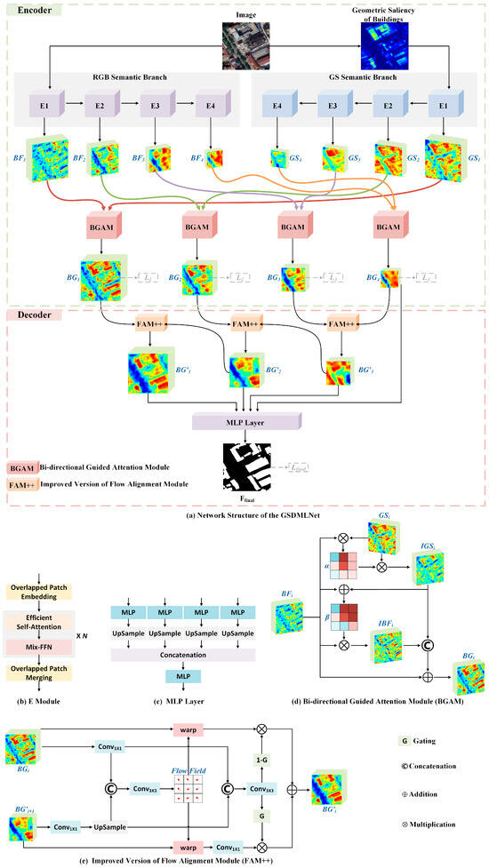 Illustrates the structure of the proposed GSDMLNet as follows: (a) Overall structure of GSDMLNet; (b) Module E in the dual-branch network; (c) MLP layer; (d) Bi-directional guided attention module (BGAM); (e) Improved version of flow alignment module (FAM++).