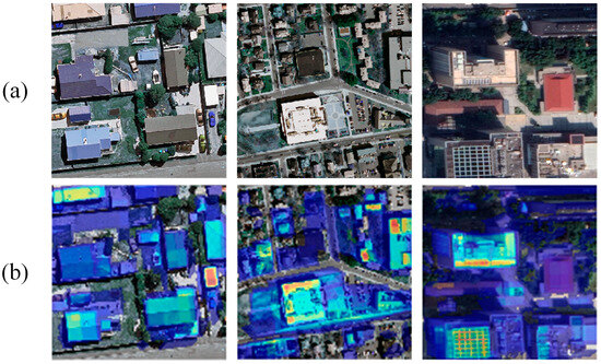 where denotes the high-resolution building feature map that contains weak semantic details, refers to the low-resolution building feature map that is rich in strong semantic content, signifies a convolution with a kernel size of , and indicates the process of up-sampling.