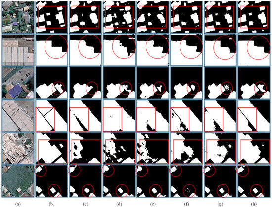 In order to confirm the efficacy of the proposed GSDMLNet in extracting buildings from aerial images, we compared it with five other methods: PSPNet [23], Deeplabv3+ [43], HRNet [44], SegFormer [45], and BEARNet [46]. PSPNet employs a pyramid pooling module to aggregate contextual information from diverse regions, thereby enhancing its capacity to encapsulate global information. Deeplabv3+ leverages spatial pyramid pooling with dilated convolutions to facilitate multi-scale feature extraction, thereby enhancing the precision of semantic segmentation boundaries. HRNet establishes parallel connections between convolutions at different resolutions to facilitate information interaction, ensuring the preservation of reliable high-resolution representations across the network. SegFormer is a network that integrates lightweight multi-layer perceptrons (MLPs) within Transformers ensuring straightforward and efficient functionality. Finally, BEARNet disentangles building bodies and boundaries, guiding the network to independently learn building boundary features and optimize the targeted acquisition of boundary features.