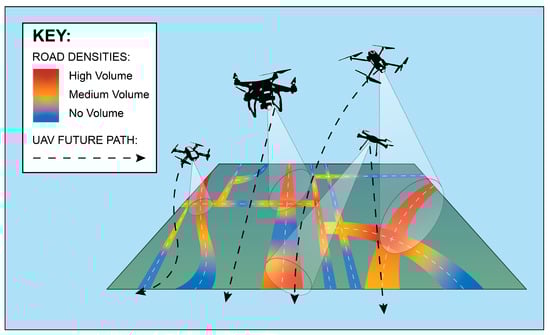 Throughout the simulations, there were approximately 120 active targets. This resulted in a greater dispersion of targets throughout the residential areas and provided more incentive for the UAVs to explore the residential areas. While this also increased the number of targets on the freeway, these road segments had a maximum reward value of . Since there was already a high number of targets on these roads the reward values of these roads were not increased as more targets were added to the simulation. The overall outcome was that by increasing the number of targets in the simulation, vehicles that explored the residential areas obtained more information and created a more accurate heat map than vehicles that focused on searching only the highest-density areas along the main freeway.