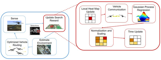 Figure 6c, where the middle freeway section has a high reward in an area that the UAVs have not searched. This suggests that the GP regression, using data from neighboring areas, has predicted a high average number of targets in those grid cells. As a result of this prediction, the grid cell is given a high maximum reward value, prompting the UAVs to prioritize searching these cells over others. In this simulation, the GP regression’s prediction would likely lead a UAV to encounter a significant number of targets in those areas.