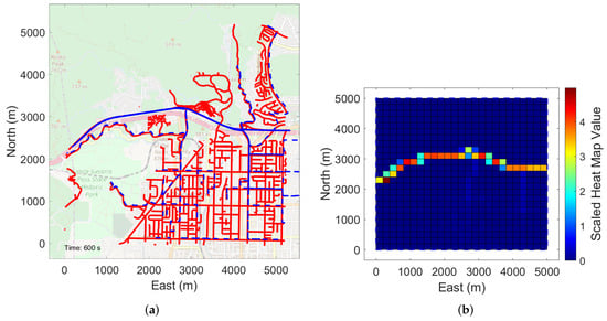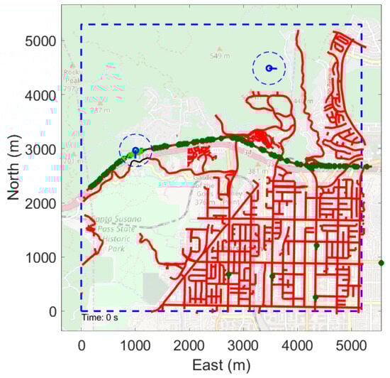 Figure 5a shows the 5000-m square search area in Chatsworth, California, with red lines indicating the targets’ paths throughout the full simulation. We generated these target paths using the Simulation of Urban Mobility (SUMO) software package [