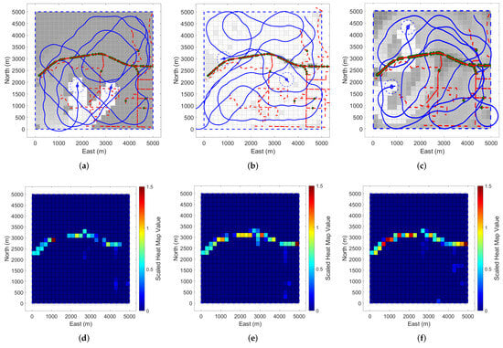 Figure 6c depicts the simulation using our GP regression search method. The UAV trajectories indicate that, in comparison to the other methods, more time is spent observing the road networks in the southwest portion of the search area, reflecting how the UAVs gravitate toward regions with higher target densities. However, the UAVs still engage in exploration, as evidenced by the comparison of their heat maps. The heat map for the single MC run of the GP regression search method is shown in