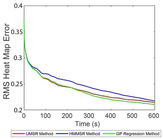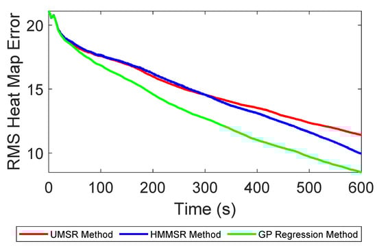 s. Initially, each method starts with the same error and the error remains close for the first part of the simulation (until about 30 s). However, following this initial period, the GP regression error decreases below that of the other methods and remains significantly lower for the rest of the simulation. The UMSR method performs worse than the HMMSR method because the HMMSR method fully leverages existing knowledge, allowing it to learn the high-density regions more accurately and quickly.
