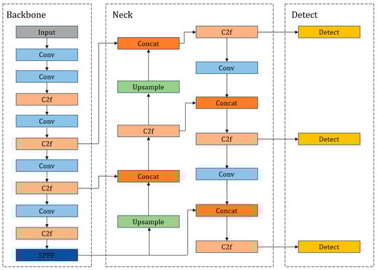 YOLOv8′s neck layer continues the FPN+PAN [30] concept from YOLOv5. Compared to YOLOv5, YOLOv8 replaces C3 with the C2f module and removes the convolutional layer before upsampling, directly upsampling output features from different stages of the backbone feature extraction network. These modifications further optimize the network structure, enhancing detection efficiency.
