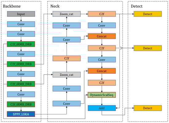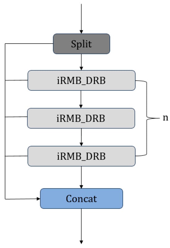 Structure of the C2f-iRMB-DRB submodule. The iRMB-DRB network enhances the model’s capability to handle features at various scales.