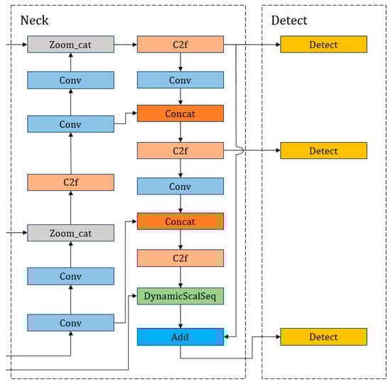 ASF-DySample transforms the neck part of YOLOv8 by introducing the DynamicScalSeq module and integrating it into the feature fusion process (Figure 5). The DynamicScalSeq module takes as input the features from different scales and dynamically samples them according to learned weights. This module dynamically adjusts the sampling strategy based on the features’ scale, allowing for better adaptation to the feature of the input image.