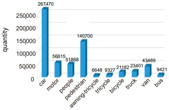 This study employs the VisDrone2019 dataset [8] for experimental validation. Both the training and validation datasets are partitioned into images sized 800 × 800 with a stride of 600. The training dataset comprises 25,447 annotated images, while the validation dataset includes 1115 images with corresponding annotations. From the validation set, 547 images are reserved for testing purposes. The VisDrone2019 dataset encompasses 10 classes, such as pedestrian, people, bicycle, car, van, truck, tricycle, awning-tricycle, bus, and motor. Through numerical analysis, as detailed in Table 1, the dataset reveals a class imbalance, characterized by numerous small objects and fewer large objects. Additionally, certain classes exhibit minimal variability and significant inter-class confusion, presenting formidable challenges (Figure 9).
