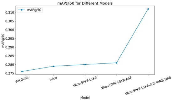 Thirdly, the final model achieves the highest mAP@50 score of 0.312, indicating its superior overall performance compared to the other models (Figure 10). Remarkably, the proposed model outperforms all other models across the board. It achieves significantly higher precision in detecting pedestrians, people, cars, and other objects, as evidenced by its superior performance in almost all object classes. The superior performance of the improved model suggests better robustness to variations in object size, orientation, and occlusion within the VisDrone2019 dataset. This robustness is particularly crucial in real-world scenarios where objects may vary significantly in appearance and context.